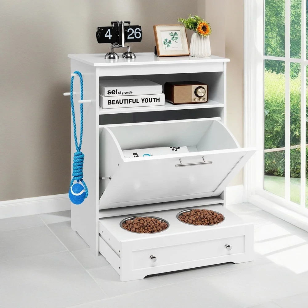 Hidden pet food container countertop and an open compartment keep your pet's supplies in order. Keeps your environment clean and tidy as always. The pull-out storage cabinet is designed for storing pet food or toys.