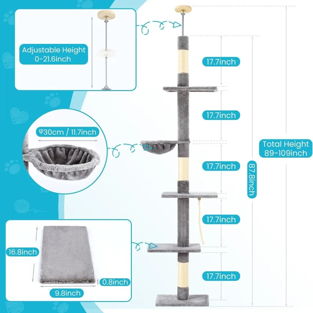 Cat Tree 5-Tier Floor to Ceiling, 89-109 Inch Adjustable Height Cat Tower with Cozy Hammock, Cat Climbing Tree for Indoor Cats,