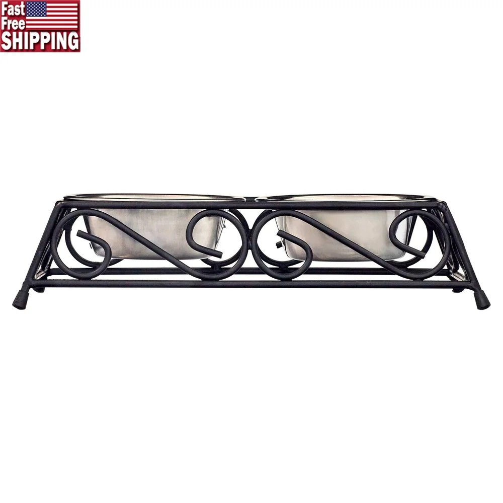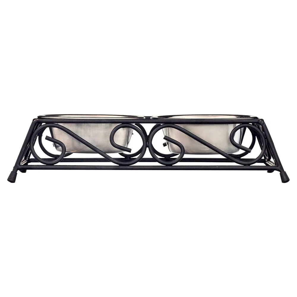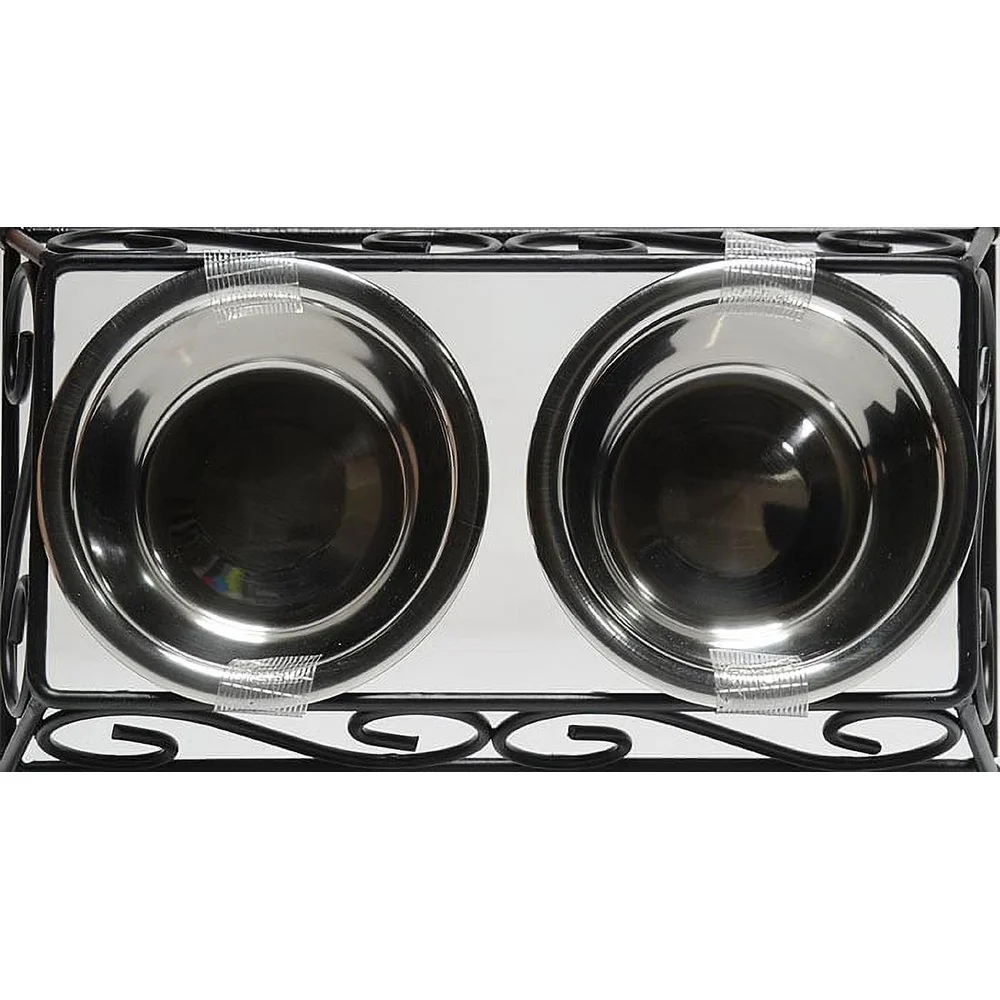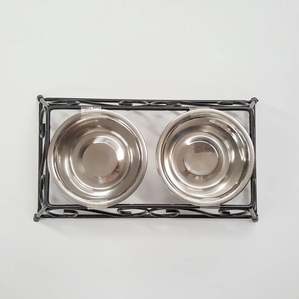 This bowl set is made of hygienic, high-quality, heavy-duty stainless steel and comes with two bowls and an elevated black stand with an elegant design.  The stand helps to elevate the bowls off the ground making it easier for your pet to eat and drink while preventing the bowls from sliding around on the floor.